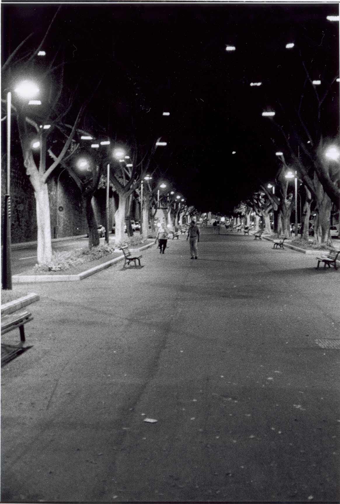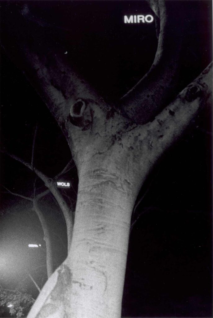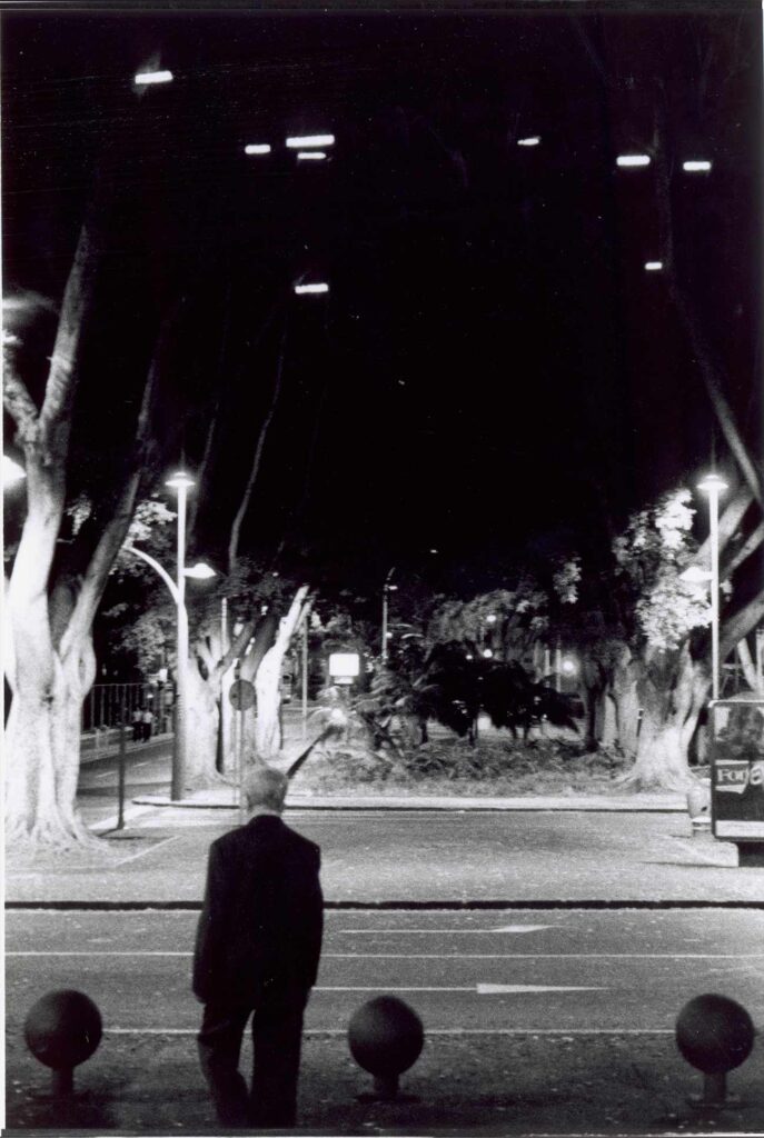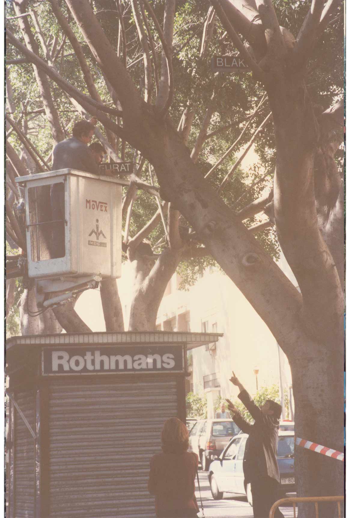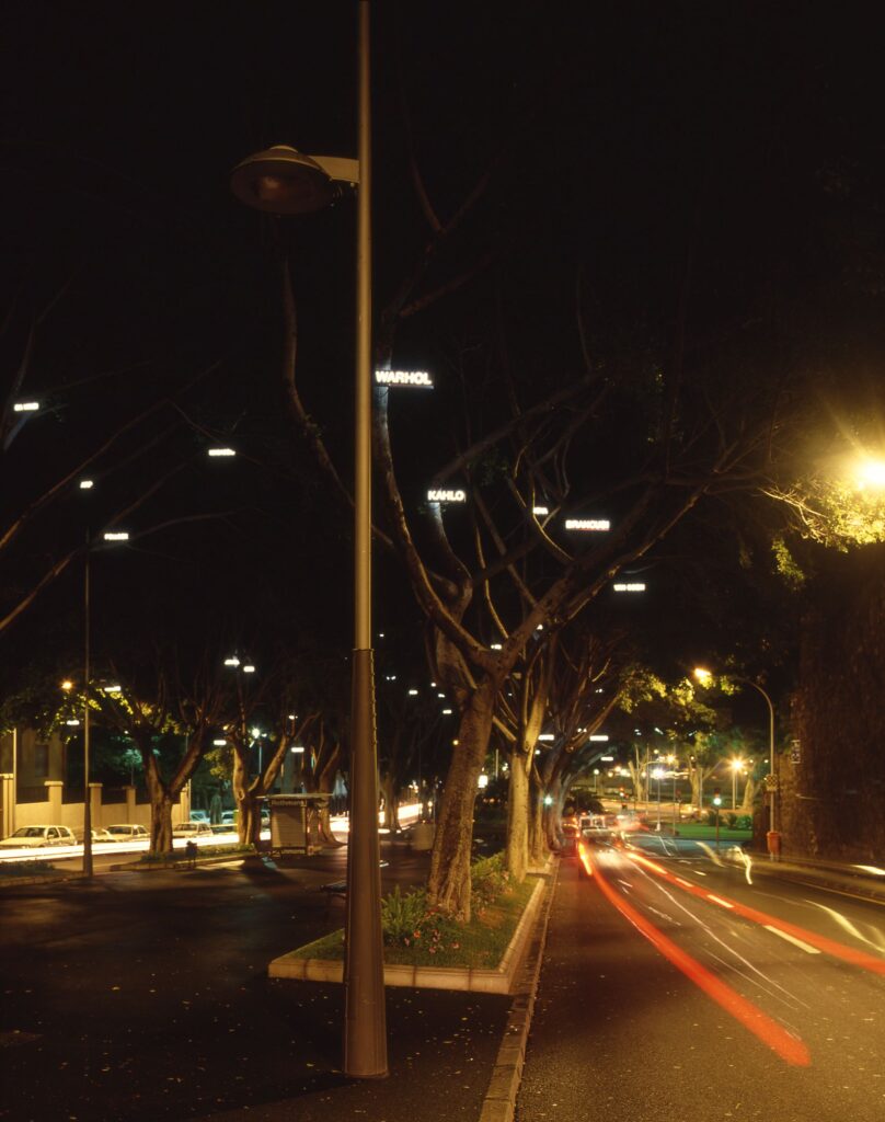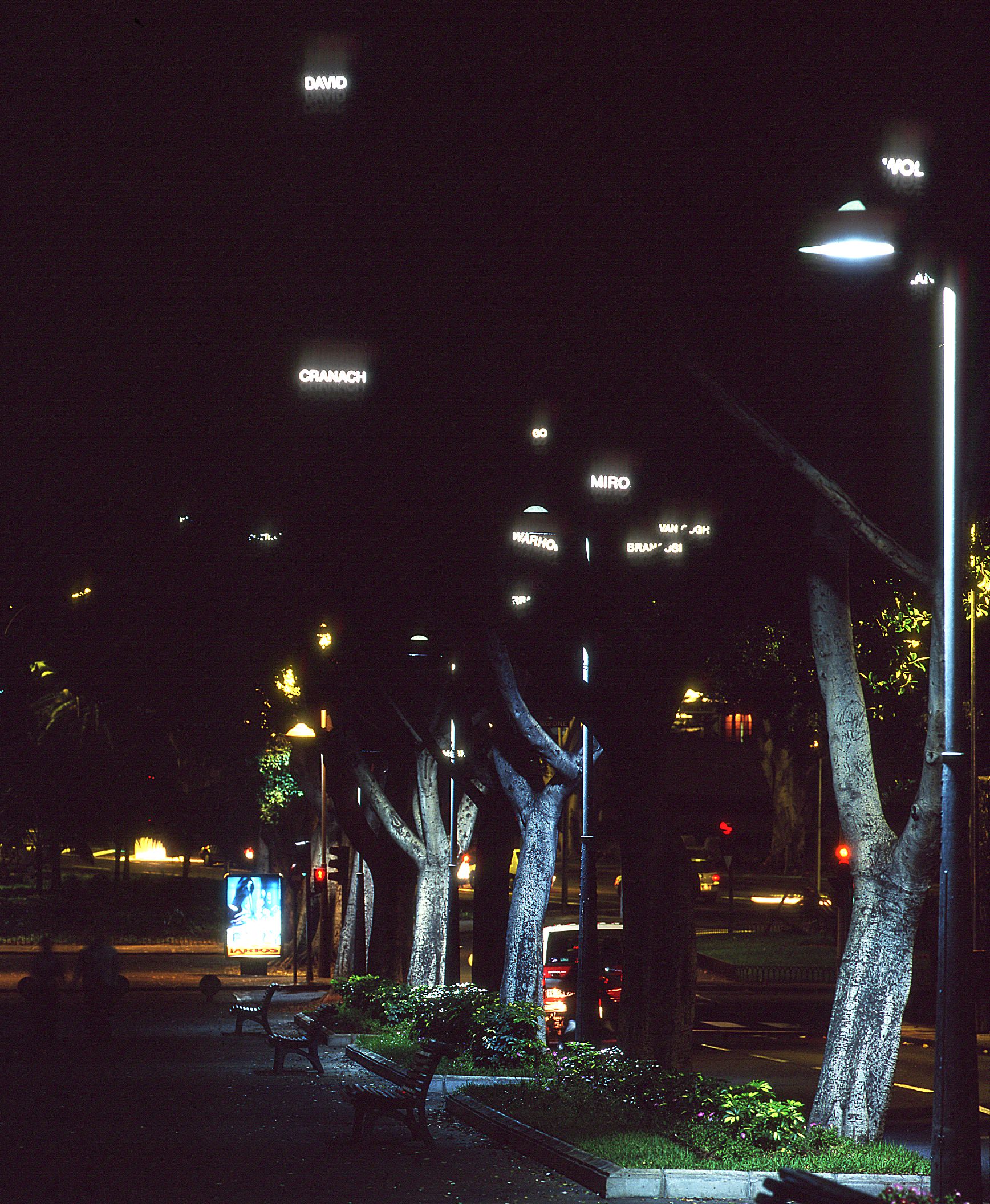 Islands (1995) is a set of 73 black aluminium, methacrylate and neon boxes suspended by steel cables from tree branches. What is striking is the contrast produced firstly between the dense and chaotic foliage of nature and the regular boxes with a random placement, but within an order. At the same time, the work can have two interpretations depending on the time of day (from the point of view of the sun’s illumination). In natural light, the unlit boxes seem almost phantasmagorical objects, they become entities suspended in time or space and can be confused with tree branches, but at night with their own lighting, which allows us to read the text contained in each box, they take on another meaning, the names take us back to beings who have lived very close to our contemporary world and who, by means of opposition to the names themselves, we can partly contemplate in a subjective way what the world of art has been during the whole of the twentieth century. This produces a true symbiosis between art and public space.