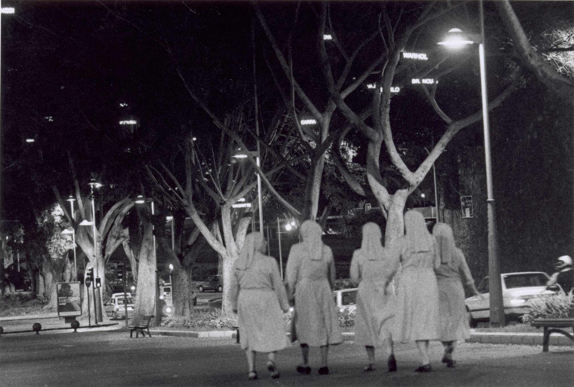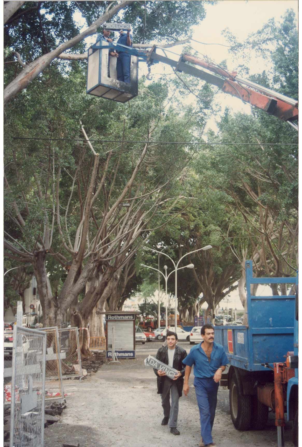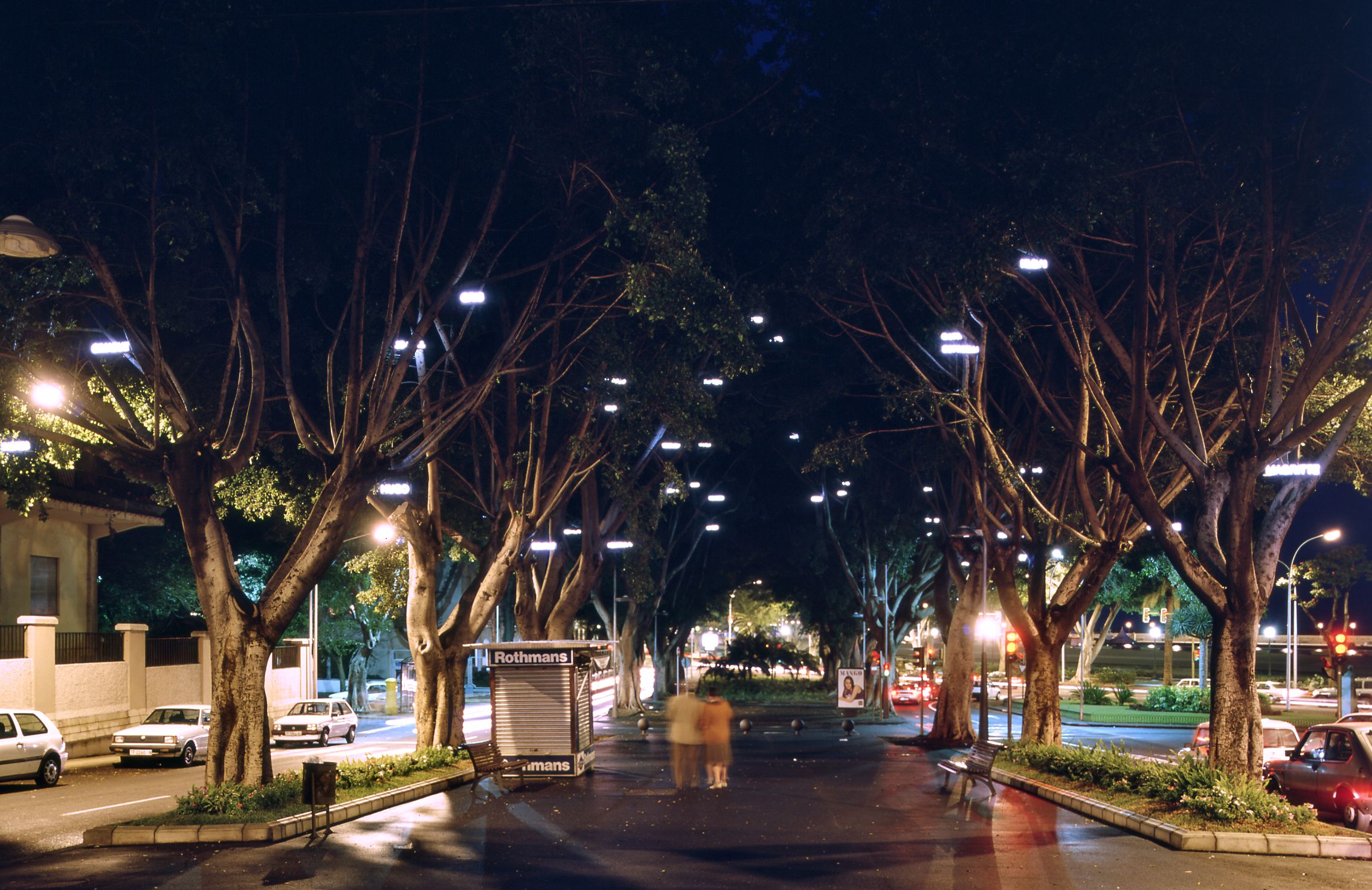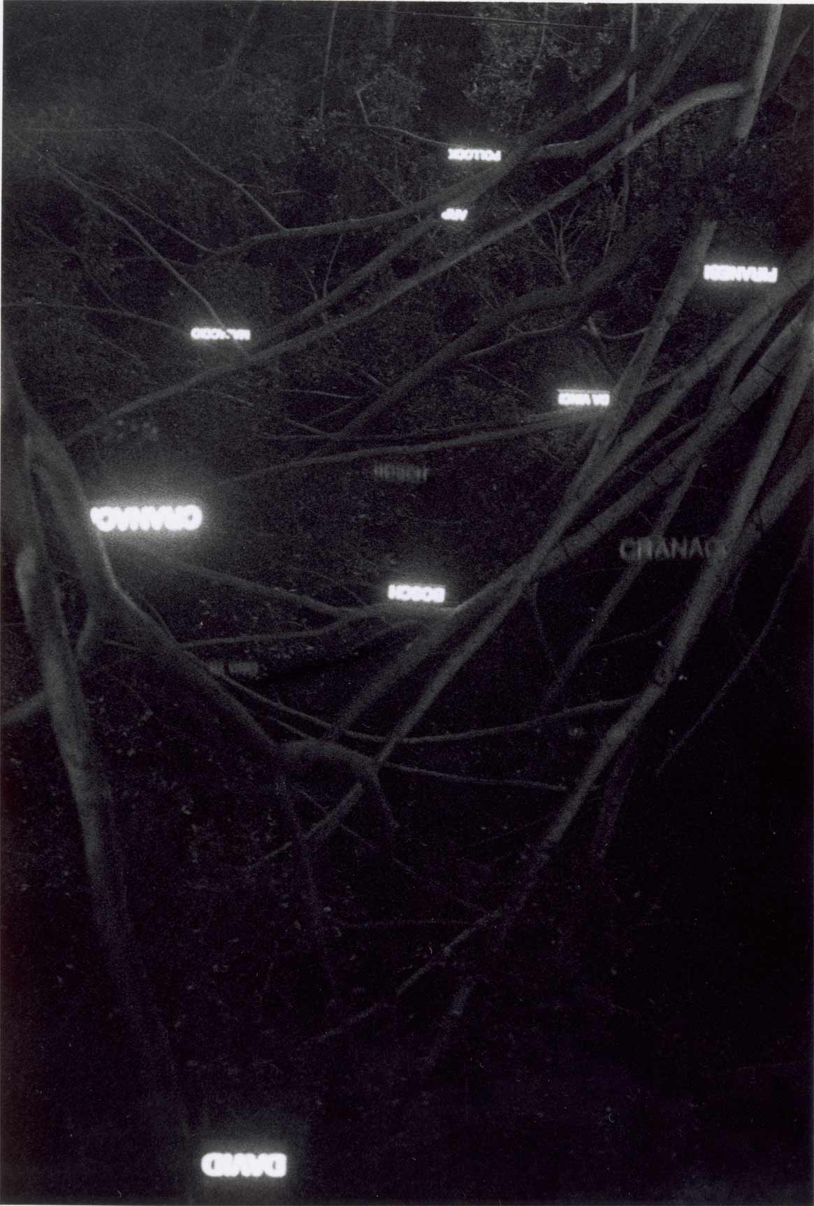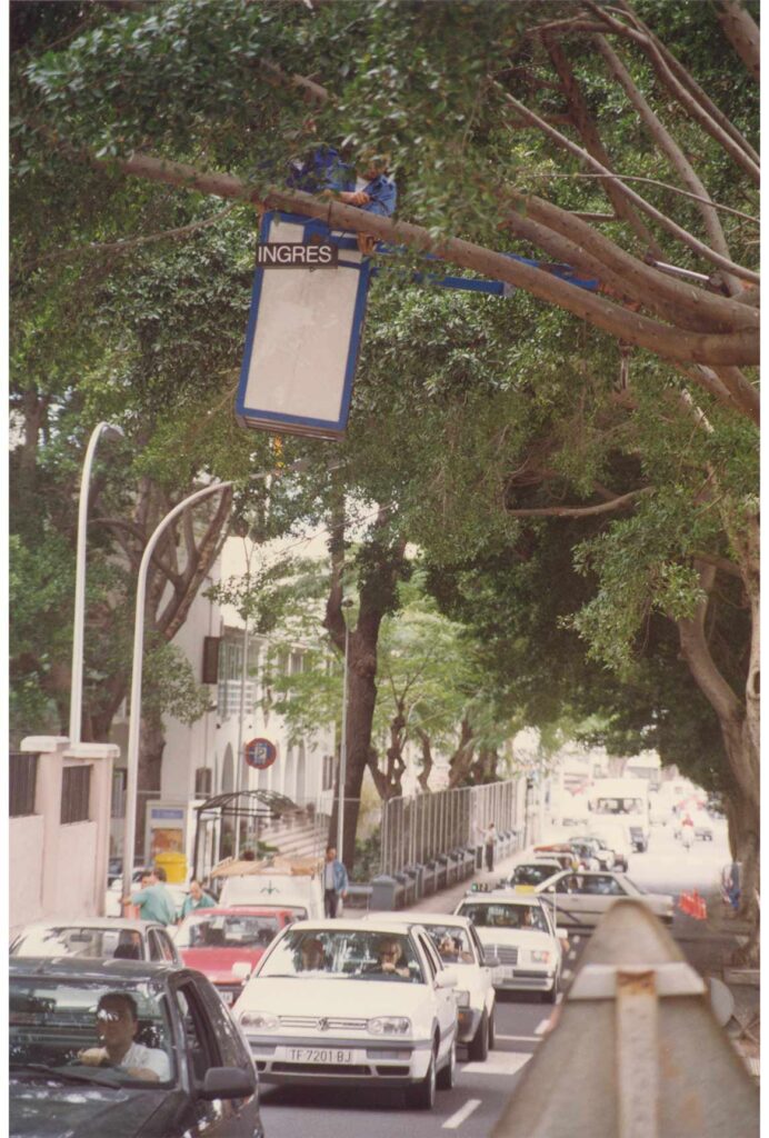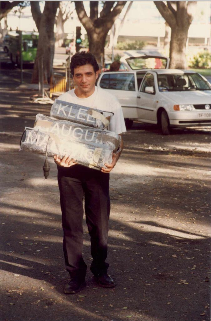 Islands (1995) is a set of 73 black aluminium, methacrylate and neon boxes suspended by steel cables from tree branches. What is striking is the contrast produced firstly between the dense and chaotic foliage of nature and the regular boxes with a random placement, but within an order. At the same time, the work can have two interpretations depending on the time of day (from the point of view of the sun’s illumination). In natural light, the unlit boxes seem almost phantasmagorical objects, they become entities suspended in time or space and can be confused with tree branches, but at night with their own lighting, which allows us to read the text contained in each box, they take on another meaning, the names take us back to beings who have lived very close to our contemporary world and who, by means of opposition to the names themselves, we can partly contemplate in a subjective way what the world of art has been during the whole of the twentieth century. This produces a true symbiosis between art and public space.