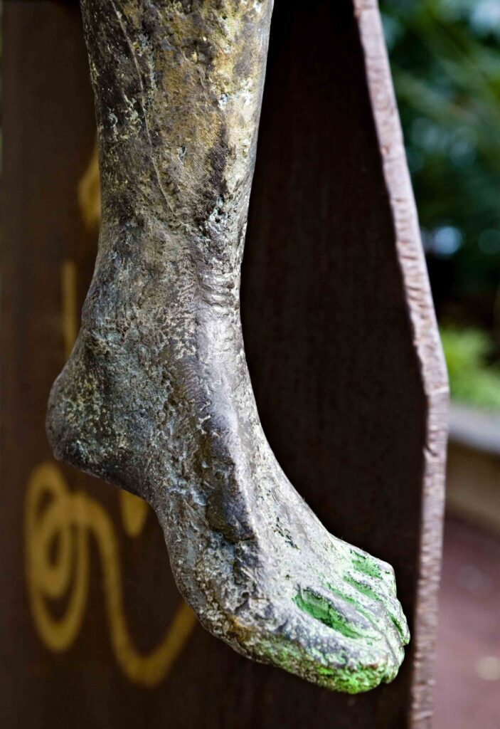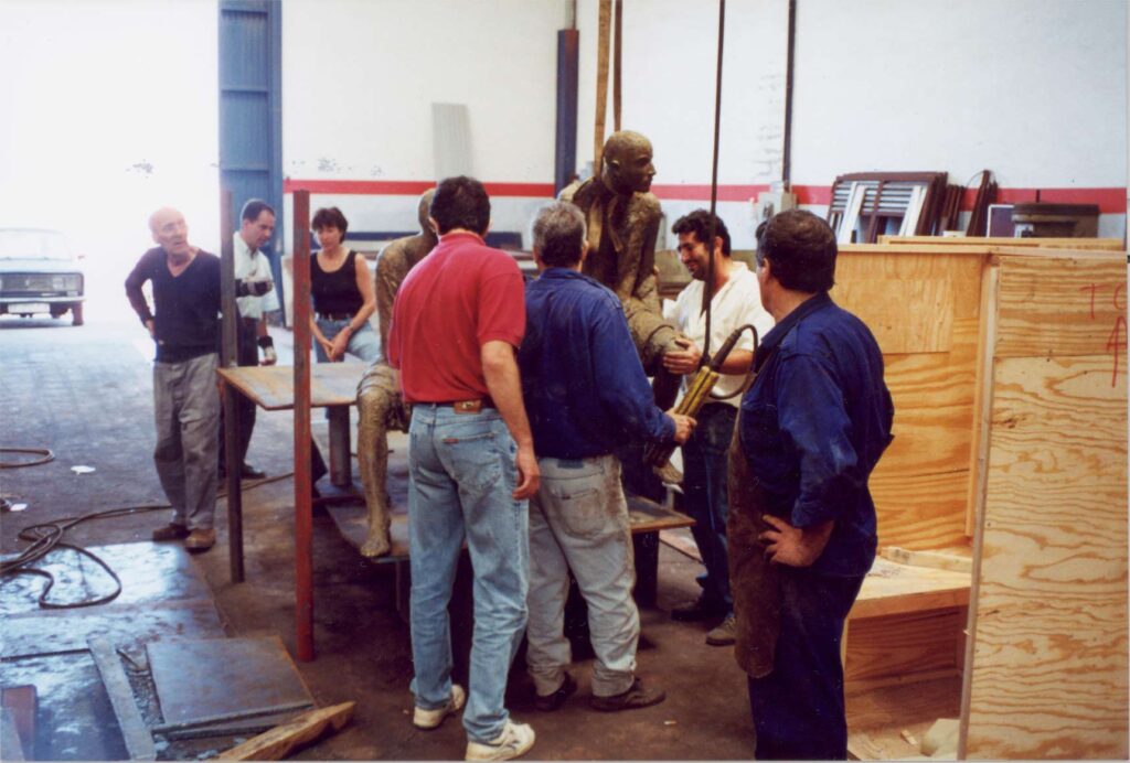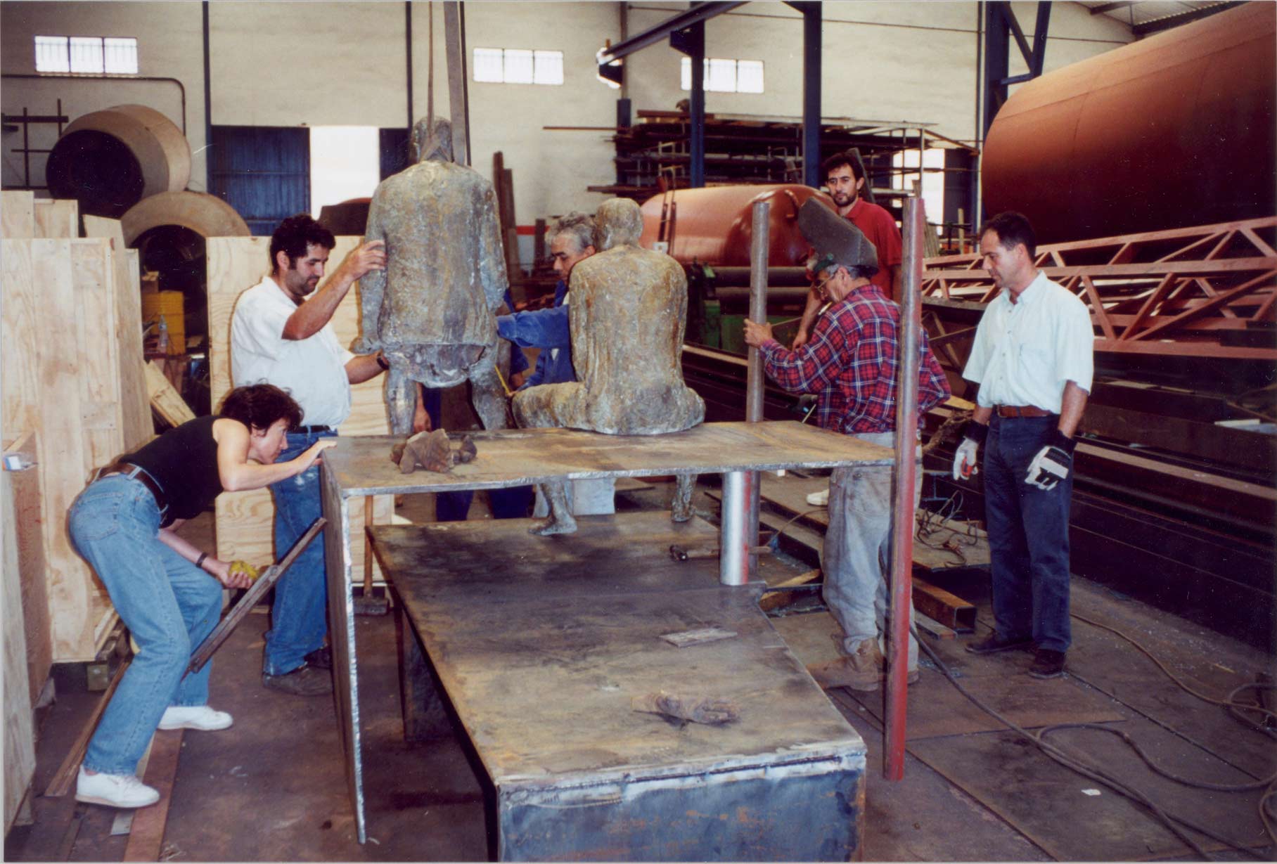Hanneke Beaumont habitualmente modela en barro sometido a la prueba del fuego, pero en este grupo de personajes los materiales empleados han sido el bronce y el acero que tienen una resolución de terminación muy diferente al barro propiamente dicho.